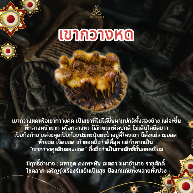 เขากวางหดหรือเขากวางคุด เป็นเขาที่ไม่ได้ขึ้นตามปกติทั้งสองข้าง แต่จะขึ้นที่กลางหน้าผาก หรือกลางหัว มีลักษณะผิดปกติ ไม่เติบโตยืดยาวเป็นกิ่งก้าน แต่จะคุดเป็นก้อนปมตะปุ่มตะป่ำอยู่ที่โคนเขา มีตั้งแต่สามยอด ห้ายอด เจ็ดยอด เก้ายอดถือว่าดีที่สุด แต่ถ้าหากเป็น “เขากวางคุดสิบสองยอด” ซึ่งถือว่าเป็นกายสิทธิ์ชั้นยอดเยี่ยม